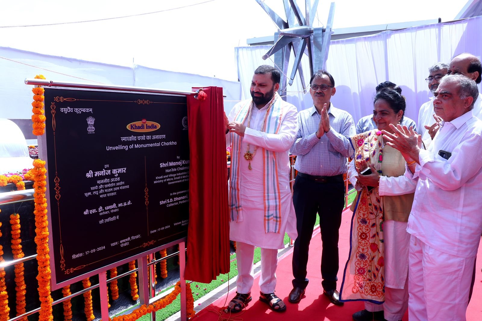 कार्यक्रम के दौरान अध्यक्ष केवीआईसी ने दिल्ली अंतर्राष्ट्रीय हवाई अड्डे पर लगे स्मारक (मॉन्यूमेंटल) चरखे की तर्ज पर अस्मावती रिवरफ्रंट पर स्टेनलेस स्टील से बने स्मारक चरखे का अनावरण किया। इससे पहले 12 सितंबर को ऐसे ही एक चरखे का अनावरण प्रधानमंत्री नरेंद्र मोदी के संसदीय क्षेत्र वाराणसी के लाल बहादुर शास्त्री अंतर्राष्ट्रीय हवाई अड्डे पर भी किया गया था। अपने अध्यक्षीय भाषण में अध्यक्ष केवीआईसी मनोज कुमार ने कहा कि स्मारक चरखे को लगाने के पीछे केवीआईसी का उद्देश्य राष्ट्रपिता महात्मा गांधी के विचारों से नयी पीढ़ी को जोड़ने के साथ ही भारत की राष्ट्रीय धरोहर खादी के बारे में लोगों को जागरूक करना है। उन्होंने आगे कहा कि ‘नये भारत की नयी खादी’ ने ‘आत्मनिर्भर और विकसित भारत अभियान’ को नयी दिशा दी है। पूज्य बापू की जन्मस्थली में स्थापित ये चरखा नयी पीढ़ी को राष्ट्रपिता की विरासत की याद दिलायेगा।