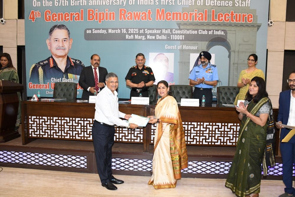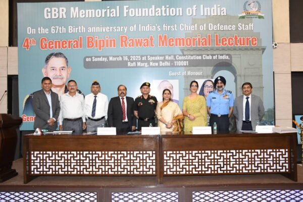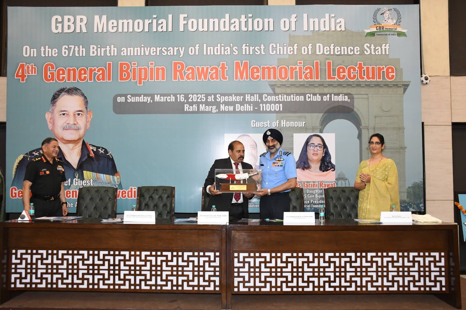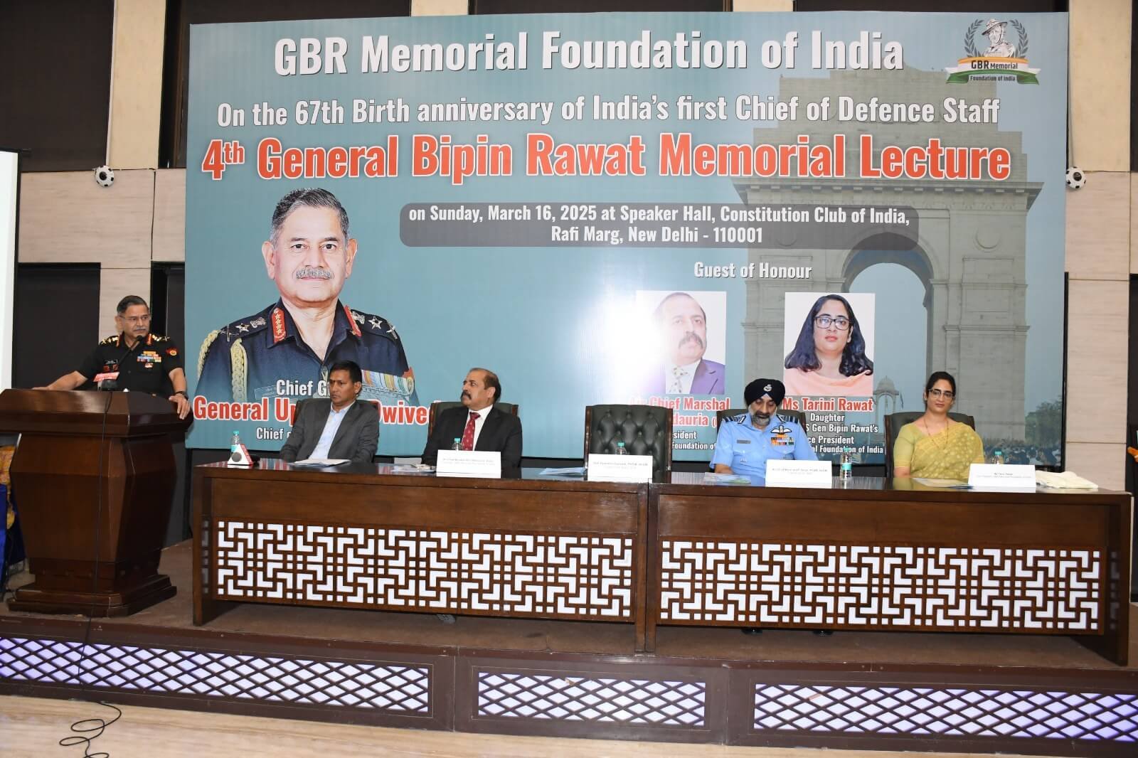 दिल्ली : कांस्टीट्यूशन क्लब में जीबीआर मेमोरियल फाउंडेशन ऑफ इंडिया ने देश के पहले सीडीएस जनरल बिपिन रावत की 67वीं जयंती पर चतुर्थ मेमोरियल लेक्चर का आयोजन किया गया। इस अवसर पर मुख्य अतिथि थलसेना प्रमुख उपेंद्र द्विवेदी, विशिष्ट अतिथि जीबीआर फाउंडेशन ऑफ इंडिया के अध्यक्ष एवं पूर्व वायुसेना प्रमुख आरकेएस भदौरिया, जनरल बिपिन रावत की सुपुत्री तारिणी रावत और आजतक के सीनियर एडिटर और वरिष्ठ रक्षा पत्रकार एवं फ़ाउंडेशन के सचिव मनजीत नेगी मुख्य वक्ता के रूप में उपस्थित रहे। इस कार्यक्रम में वायुसेना प्रमुख एपी सिंह समेत तीनों सेनाओं के अधिकारी, रक्षा सुरक्षा से अधिकारी शामिल हुए।