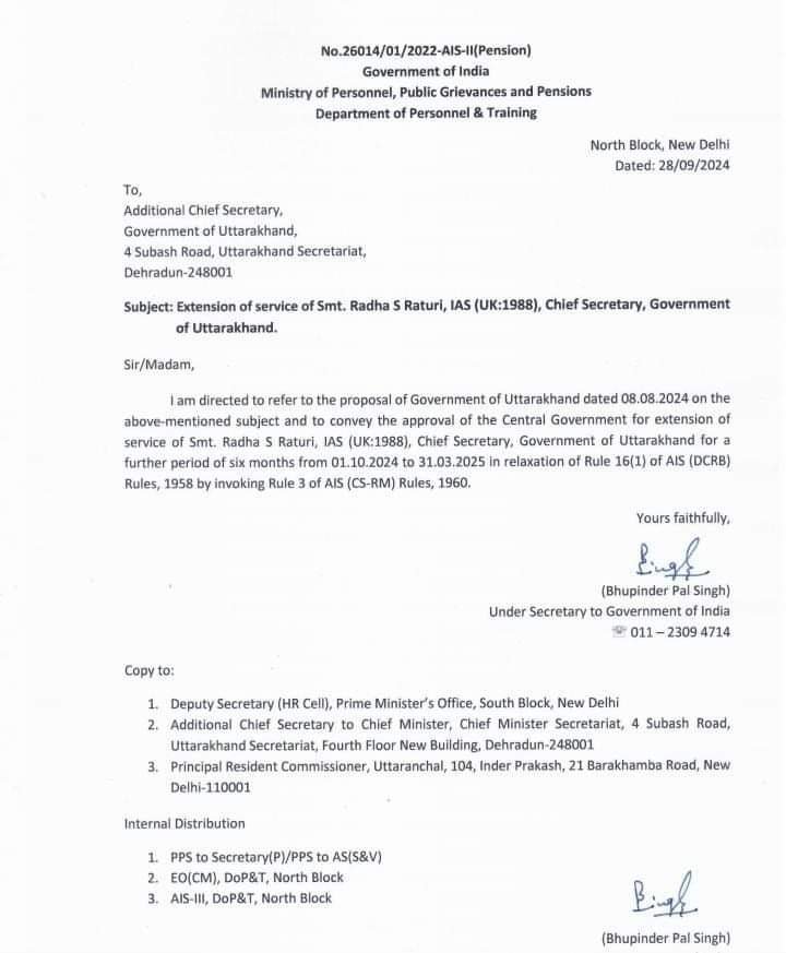देहरादून: प्रदेश की पहली महिला मुख्य सचिव राधा रतूड़ी एक बार 06 माह का सेवा विस्तार मिल गया है। उनके सेवा विस्तार को लेकर पिछले कई दिनों से कयास लगाए जा रहे थे। मीडिया में भी उनके सेवा विस्तार को लेकर अनुमान लगाए जा रहे थे, लेकिन सरकार ने उनके सेवा विस्तार को लेकर पहले ही फैसला ले लिया था, जिसकी किसी को कानों-कान खबर तक नहीं लगी। उत्तराखंड सरकार के 08 अगस्त को केंद्र सरकार को प्रस्ताव भेजा था। जिस पर AIS (DCRB) नियम, 1958 के नियम 16(1) में छूट देते हुए AIS (CS-RM) नियम, 1960 के नियम 3 को लागू करके राधा रतूड़ी, IAS (UK:1988), मुख्य सचिव, उत्तराखंड सरकार की सेवा को 01.10.2024 से 31.03.2025 तक छह महीने की अतिरिक्त अवधि के लिए विस्तारित करने के लिए केंद्र सरकार ने मंजूरी दी है।