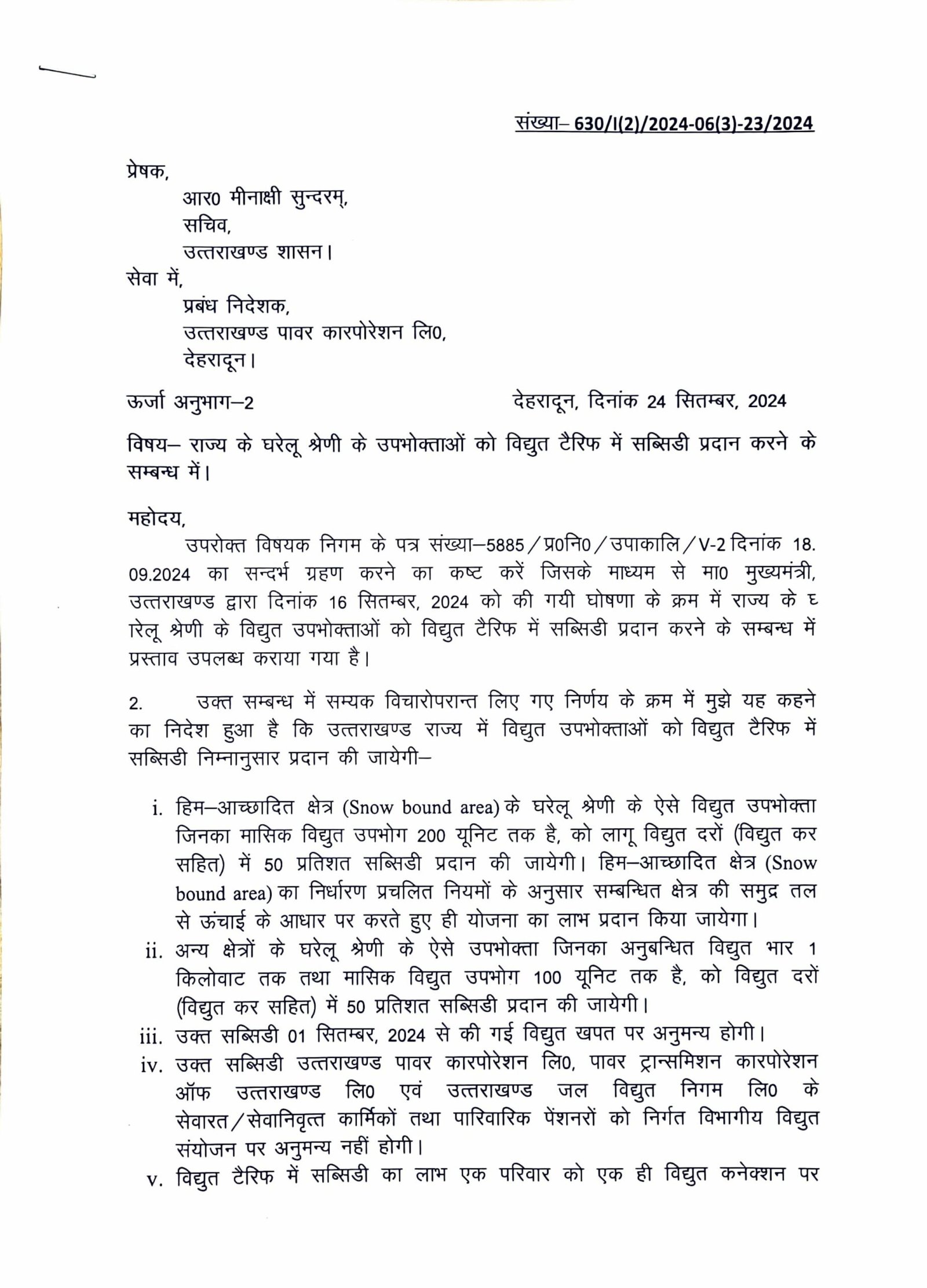 देहरादून : मुख्यमंत्री पुष्कर सिंह धामी द्वारा 16 सितम्बर, 2024 को की गयी घोषणा के क्रम में राज्य के घरेलू श्रेणी के विद्युत उपभोक्ताओं को विद्युत टैरिफ में सब्सिडी प्रदान करने के सम्बन्ध में शासनादेश जारी कर दिया गया है। सचिव आर मीनाक्षी सुंदरम द्वारा जारी शासनादेश के अनुसार उत्तराखण्ड राज्य में विद्युत उपभोक्ताओं को विद्युत टैरिफ में सब्सिडी निम्नानुसार प्रदान की जायेगी।