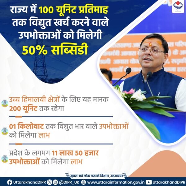 Home » Blog » राज्य के घरेलू विद्युत उपभोक्ताओं को बड़ी राहत, सीएम पुष्कर सिंह धामी की घोषणा के 10 दिन के भीतर शासनादेश जारी, मासिक विद्युत उपभोग 100 यूनिट तक विद्युत दरों में 50 प्रतिशत सब्सिडी