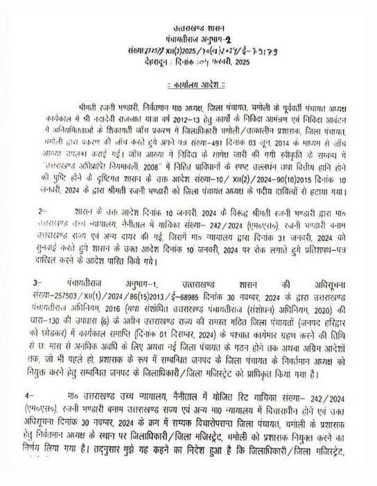 शासन द्वारा 30 नवम्बर 2024 को जारी अधिसूचना के अनुसार, उत्तराखंड पंचायतीराज अधिनियम, 2016 (संशोधित उत्तराखंड पंचायतीराज अधिनियम, 2020) की धारा 130 की उपधारा (6) के तहत, समस्त जिला पंचायतों में कार्यकाल समाप्त होने के बाद या नई जिला पंचायत के गठन तक प्रशासक के रूप में निवर्तमान अध्यक्ष को नियुक्त किया गया है।