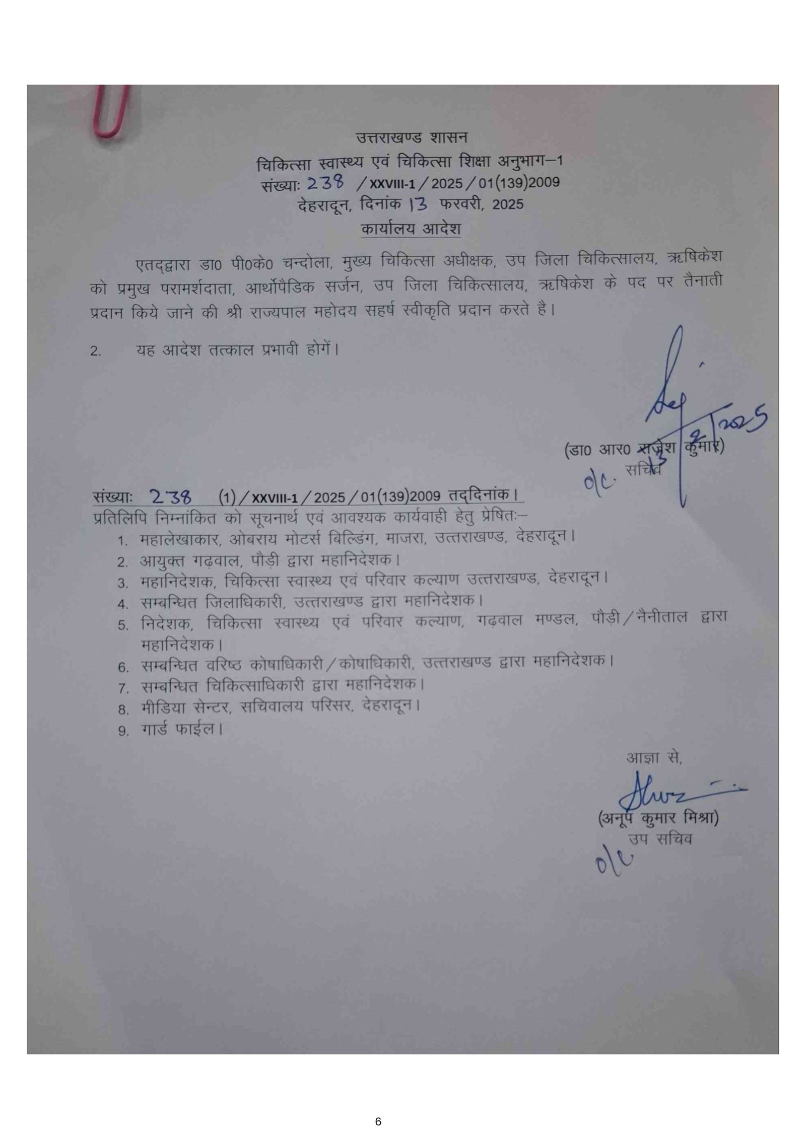 देहरादून : प्रदेश में स्वास्थ्य सेवाओं को और अधिक प्रभावी एवं सुचारू बनाने के उद्देश्य से स्वास्थ्य विभाग द्वारा विभिन्न जिलों में मुख्य चिकित्सा अधिकारी (CMO) और मुख्य चिकित्सा अधीक्षक (CMS) के पदों पर आवश्यक प्रशासनिक बदलाव किए गए हैं। स्वास्थ्य सचिव डॉ. आर. राजेश कुमार ने बताया कि राज्य सरकार जनता को बेहतर स्वास्थ्य सुविधाएं प्रदान करने के लिए कृतसंकल्पित है। इसी क्रम में विभागीय मूल्यांकन एवं कार्यक्षमता के आधार पर कई जिलों में CMO और CMS के पदों पर नई नियुक्तियां की गई हैं। इन बदलावों का उद्देश्य स्वास्थ्य सेवाओं में पारदर्शिता, कार्यकुशलता और जवाबदेही को बढ़ाना है, जिससे प्रदेशवासियों को उच्च गुणवत्ता वाली चिकित्सा सुविधाएं समय पर मिल सकें। उन्होंने कहा कि सभी नव नियुक्त अधिकारी अपने-अपने जिलों में चिकित्सा व्यवस्थाओं को बेहतर बनाने की दिशा में तत्परता से कार्य करेंगे। सरकार द्वारा स्वास्थ्य ढांचे को सुदृढ़ करने के लिए सभी आवश्यक कदम उठाए जा रहे हैं, जिससे आमजन को लाभ मिल सके। स्वास्थ्य सचिव ने जनता से अपील की कि वे सरकार द्वारा संचालित स्वास्थ्य योजनाओं का अधिक से अधिक लाभ उठाएं और किसी भी समस्या के समाधान के लिए संबंधित अधिकारियों से संपर्क करें।