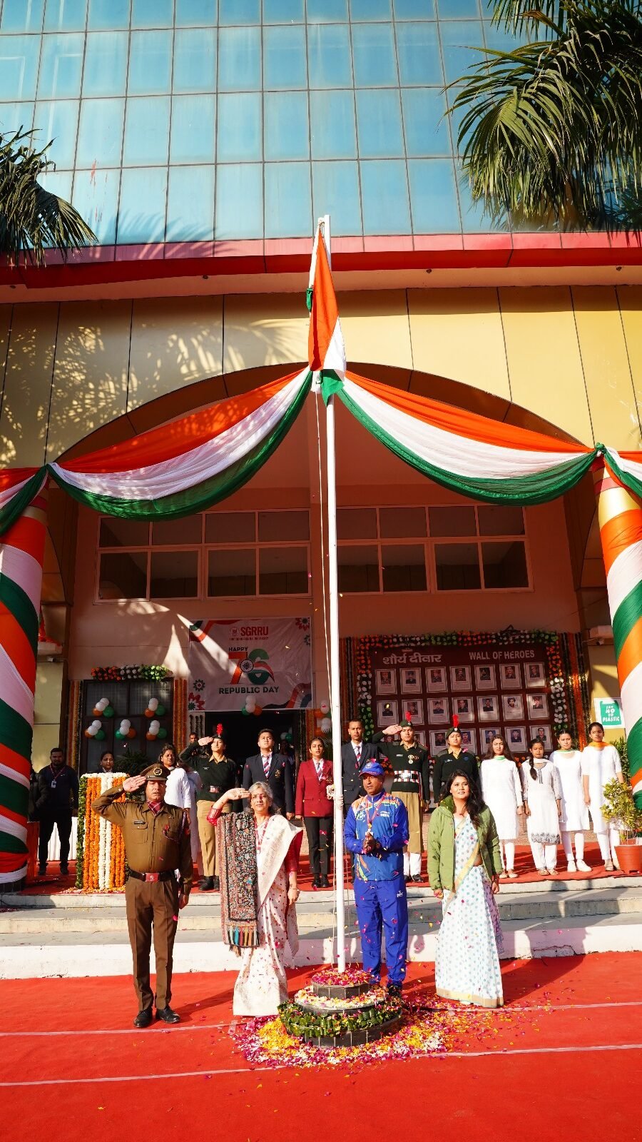 देहरादून। श्री गुरु राम राय विश्वविद्यालय (एसजीआरआरयू) सहित एसजीआरआर गुप के संस्थानों में गणतन्त्र दिवस समारोह धूमधाम के साथ मनाया गया। श्री दरबार साहिब श्री गुरु राम राय विश्वविद्यालय सहित एसजीआरआर के विभिन्न संस्थानों में गणतन्त्र दिवस पर मनमोहक कार्यक्रम आयोजित किए गए। श्री गुरु राम राय विश्वविद्यालय के एनएसएस, एनसीसी कैडेट्स, एनसीसी छात्र.छात्राओं सहित विश्वविद्यालय के 11 संघटक स्कूलों के छात्र.छात्राओं ने अनुशासित परेड से सबका मन मोह लिया।