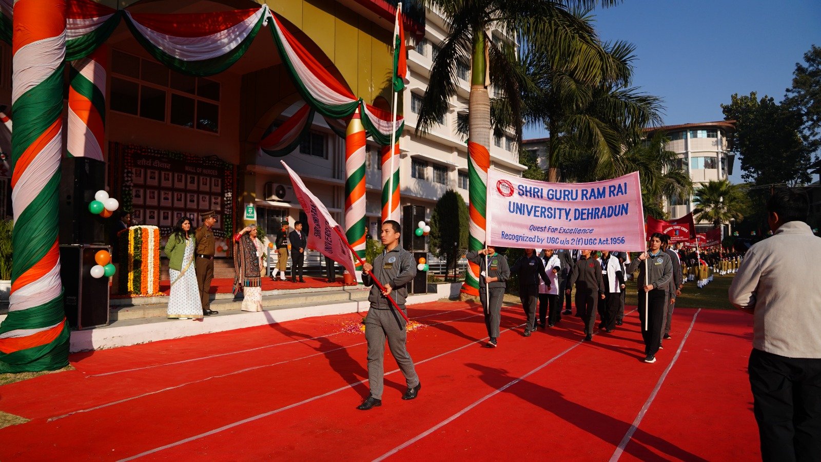 कार्यक्रम में प्रणव धनावडे, सीनियर अंडर ऑफिसर यश गुसाईं, सीनियर अंडर ऑफिसर यश बरमोला, अंडर ऑफिसर सृष्टि बरमोला, अंडर ऑफिसर प्रिंयाशू पंवार, सारजेंट श्रेया बिष्ट, कैडेट सिद्धांत थापा को उल्लेखनीय योदान के लिए कुलपति ने स्मृति चिन्ह देकर सम्मानित किया। श्री गुरु राम राय इंस्टीट्यूट ऑफ मेडिकल एण्ड हैल्थ साइंसेज में मेडिकल छात्र-छात्राओं ने देश भक्ति से ओत प्रोत गीतों के द्वारा राष्ट्रभक्ति की अलख जगाई।