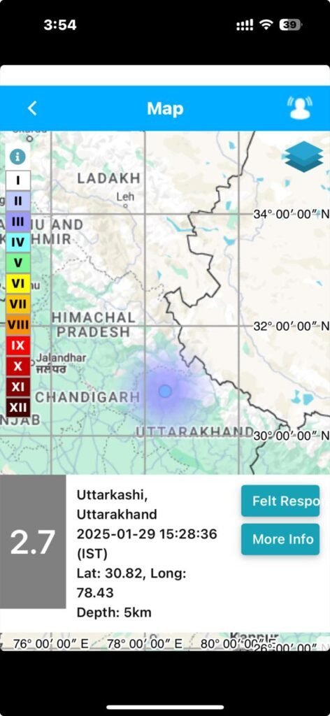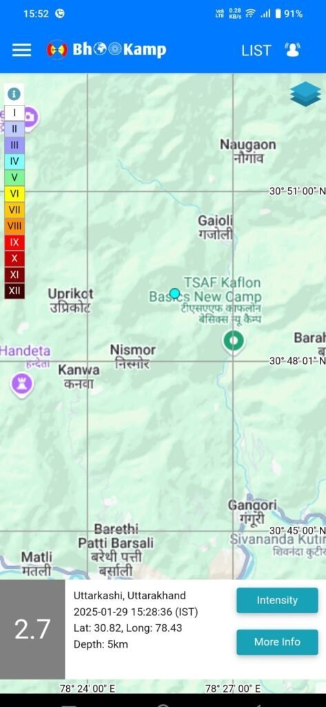 उत्तरकाशी : जिले में मंगलवार दोपहर 3:28 बजे हल्के भूकंप के झटके महसूस किए गए। भूकंप की तीव्रता 2.07 मापी गई, जिसका केंद्र तहसील भटवाड़ी के ग्राम साल्ड उपरिकोट और निसमोर के मध्य वन क्षेत्र में था। भूकंप की गहराई 5 किमी दर्ज की गई। जिला मुख्यालय और संगमचट्टी क्षेत्र में झटके महसूस किए गए, जबकि अन्य तहसीलों में इसका प्रभाव नगण्य रहा। फिलहाल किसी प्रकार की जनहानि या संपत्ति के नुकसान की सूचना नहीं है। प्रशासन स्थिति पर नजर बनाए हुए है और जिले में स्थिति सामान्य बनी हुई है।