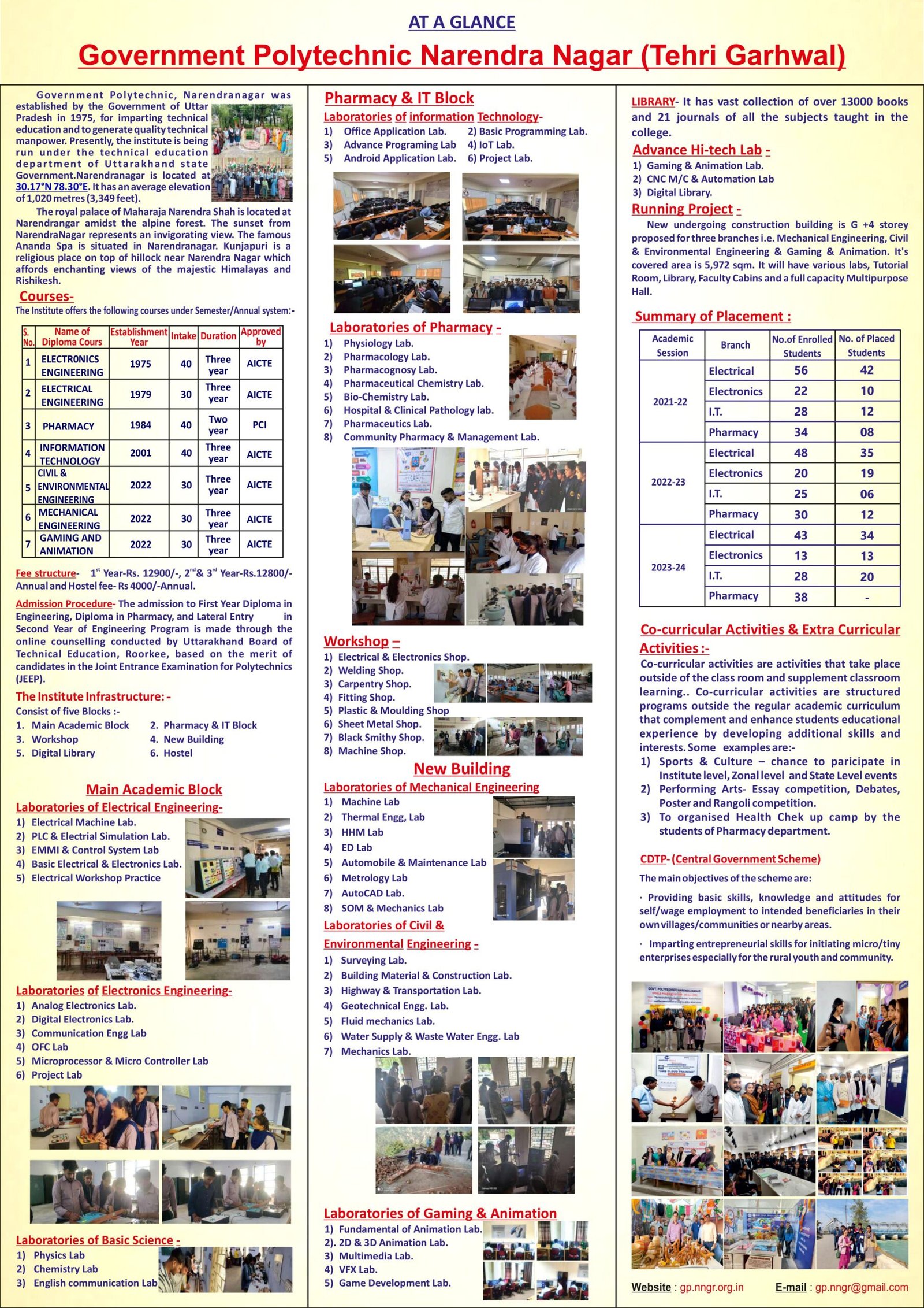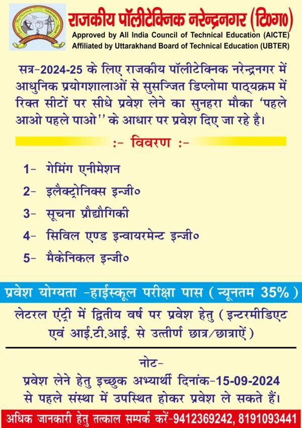 राजकीय पॉलीटेक्निक नरेन्द्र नगर के प्रधानाचार्य ओंकार शर्मा ने बताया कि विद्यार्थी अब बिना प्रवेश परीक्षा के अपने पसंदीदा कोर्स में प्रवेश ले सकते हैं. संस्थान में गेमिंग एनिमेशन, इलेक्ट्रोनिक्स इंजिनयरिंग, सूचना प्रौद्योगिकी, सिविल एंड इन्वायरमेंट इंजीनियरिंग एवं मैकेनिकल इंजीनियरिंग डिप्लोमा कोर्स में प्रवेश ले सकते हैं.