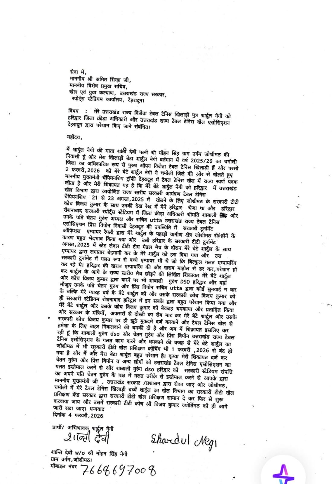 चमोली जिले के उर्गम ज्योतिर्मठ निवासी उभरते टेबल टेनिस खिलाड़ी शार्दुल नेगी के परिजनों ने खेल विभाग के अधिकारियों और संघ पदाधिकारियों पर गंभीर आरोप लगाते हुए मुख्यमंत्री और खेल सचिव से हस्तक्षेप की मांग की है। शार्दुल की माता शांति देवी द्वारा प्रेषित शिकायत के अनुसार, चमोली की ओर से खेलते हुए राज्य स्वर्ण पदक जीतने वाले शार्दुल को अगस्त 2025 में हरिद्वार में आयोजित एक प्रतियोगिता के दौरान उनके ‘पहाड़ी’ और ‘ग्रामीण’ मूल का होने के कारण भेदभाव का सामना करना पड़ा। आरोप है कि वहां जिला क्रीड़ा अधिकारी और टेबल टेनिस एसोसिएशन के पदाधिकारियों ने न केवल गलत अंपायरिंग के जरिए खिलाड़ी का मनोबल तोड़ा, बल्कि विरोध करने पर शार्दुल और उनके कोच विजय कुमार को मानसिक रूप से प्रताड़ित किया और भविष्य बर्बाद करने की धमकी भी दी। इस उत्पीड़न के चलते जोशीमठ में संचालित सरकारी टीटी प्रशिक्षण केंद्र भी बंद हो गया है, जिससे एक होनहार खिलाड़ी का भविष्य अंधकार में है। परिजनों ने दोषियों पर कार्रवाई करने और प्रशिक्षण केंद्र को पुनः सुचारू रूप से शुरू करवाने की अपील की है।
