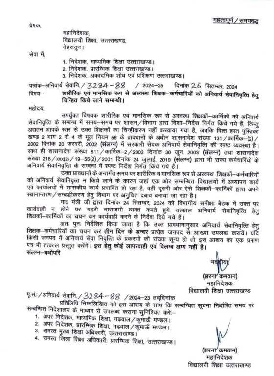 देहरादून : शिक्षा विभाग से बड़ी खबर है। शिक्षा महानिदेशक झरना कमठान ने शारीरिक और मानसिक रूप से अस्वस्थ शिक्षक – कर्मचारियों को अनिवार्य सेवानिवृत्ति के लिए चिन्हित करने के निर्देश दिए हैं। उपर्युक्त विषयक शारीरिक और मानसिक रूप से अस्वस्थ शिक्षकों कार्मिकों को अनिवार्य सेवानिवृत्ति के सम्बन्ध में समय-समय पर शासन / विभाग द्वारा दिशा-निर्देश निर्गत किये गये हैं, किन्तु अद्यतन आपके स्तर से उक्त शिक्षकों का चिन्हीकरण नहीं करवाया गया है।