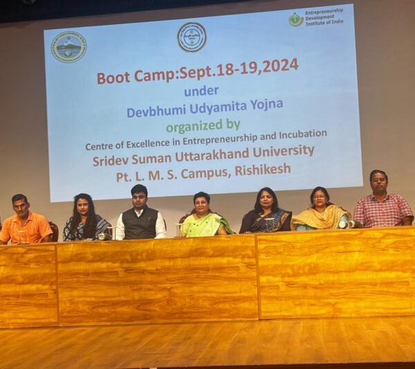 Jऋषिकेश : श्री देव सुमन उत्तराखंड विश्वविद्यालय के पंडित ललित मोहन शर्मा परिसर ऋषिकेश में दो दिवसीय बूट कैंप का शुभारंभ विश्वविद्यालय के उद्यमिता और इनक्यूबेशन उत्कृष्टता केंद्र की निदेशक प्रोफेसर अनीता तोमर, देवभूमि उद्यमिता योजना प्रोजेक्ट अधिकारी डॉ. सुमित कुमार, प्रोजेक्ट मैनेजर रतुला दास द्वारा, फैकल्टी मैटर प्रोफेसर अंजनी प्रसाद दुबे, डॉ शालिनी रावत और डॉ गौरव वाष्र्णेय द्वारा किया गया ।