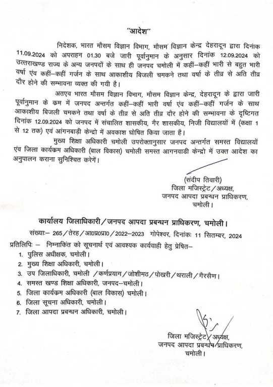 मौसम: मौसम विभाग के भारी बारिश के अलर्ट को देखते हुए चमोली और बागेश्वर जिला प्रशासन ने सरकारी व गैर सरकारी विद्यालयों में एक से 12वीं तक की कक्षाओं में अवकाश घोषित कर दिया है। आंगनबाड़ी केंद्रों में भी अवकाश रहेगा। मौसम विज्ञान केंद्र के निदेशक बिक्रम सिंह ने बताया कि उत्तराखंड में मानसून की विदाई की आधिकारिक तिथि 15 सितंबर है। इससे पहले प्रदेश के पर्वतीय जिलों के साथ मैदानी इलाकों में भी कहीं-कहीं भारी बारिश होने के आसार हैं। 14 सितंबर तक संवेदनशील इलाकों में रहने वाले लोगों को अधिक सतर्कता के साथ रहने की जरूरत है। उनका कहना है कि आवश्यक न हो, तो यात्रा करने से भी बचें।